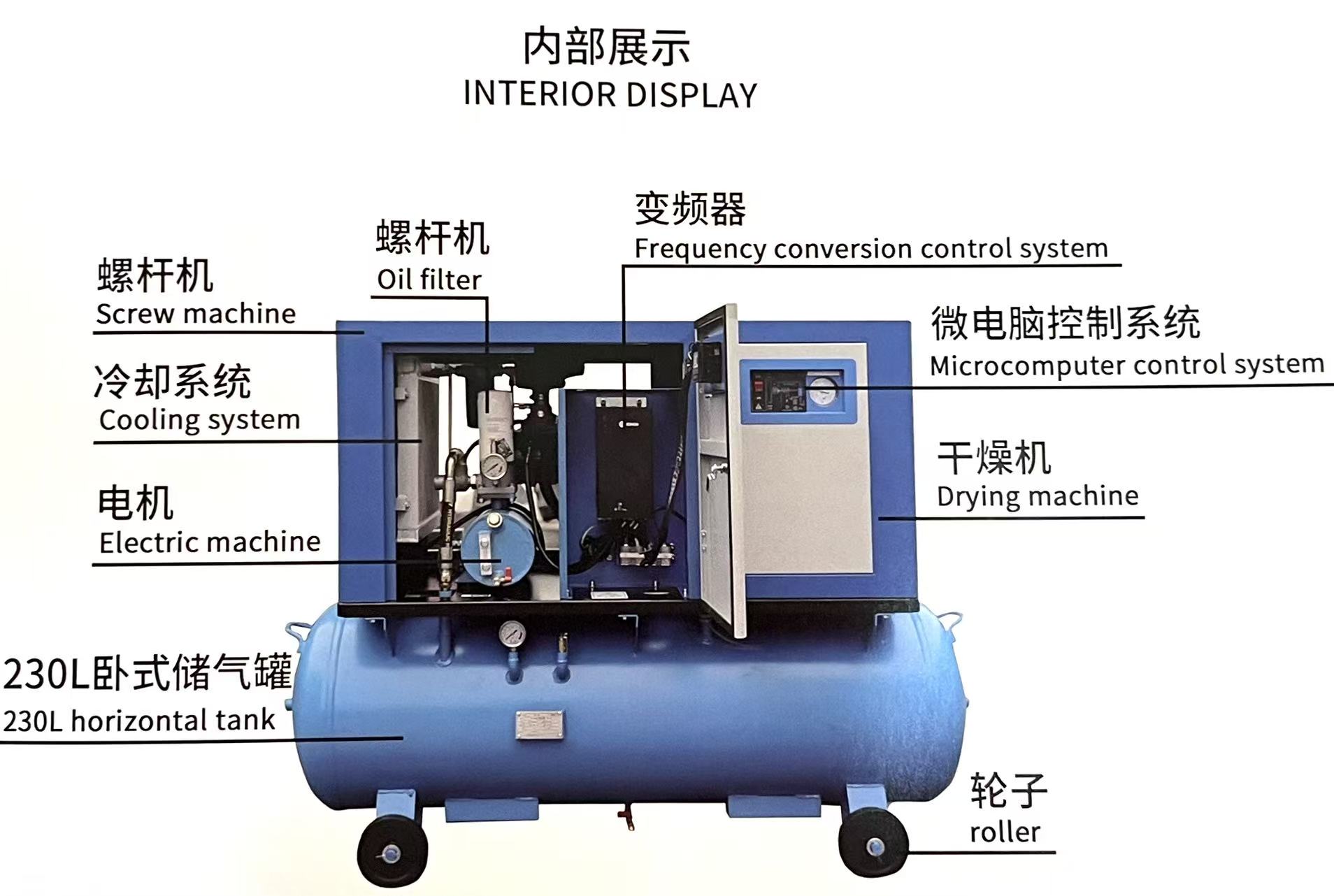 The integrated design not only simplifies maintenance but also ensures the stability of the equipment. The closely matched components avoid the hidden dangers of air leakage and pressure instability caused by loose pipeline connections in traditional split systems. The built-in variable frequency technology and microcomputer control system further enhance the stability of the equipment: the variable frequency technology adjusts the operation speed in real time according to the air demand, avoiding the impact of sudden load changes on the equipment; the microcomputer control system monitors the operation status of the equipment 24 hours a day, and issues an alarm in time when an abnormality occurs, helping enterprises find and solve problems in the early stage, and avoiding serious failures and production shutdowns.